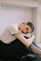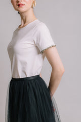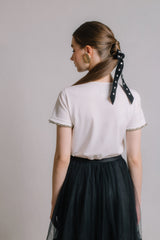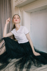 For dressy days, pair our tee with our black tulle skirt and a heels for an elegant look.
